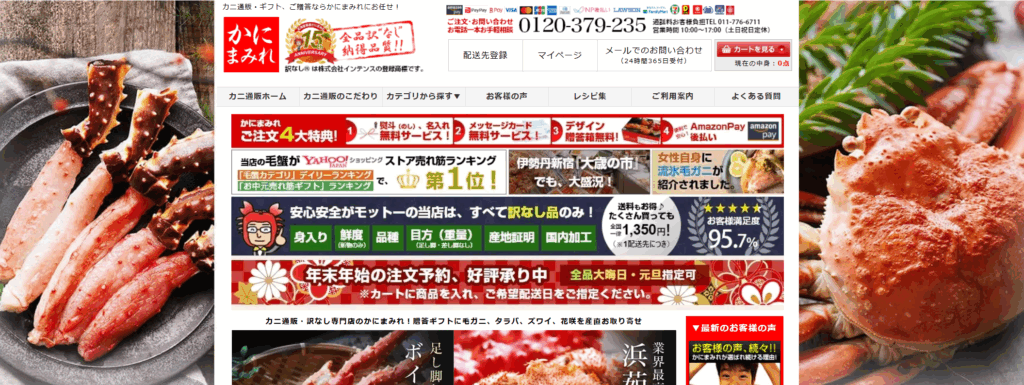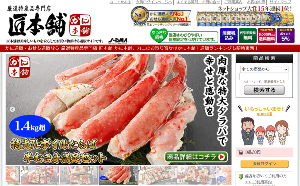 サイト内の商品ラインナップは、ズワイガニ、タラバガニ、毛ガニなど定番のほか、「訳あり越前ガニ」や「かにしゃぶセット」など、家族向けにもぴったりのバリエーションが豊富。